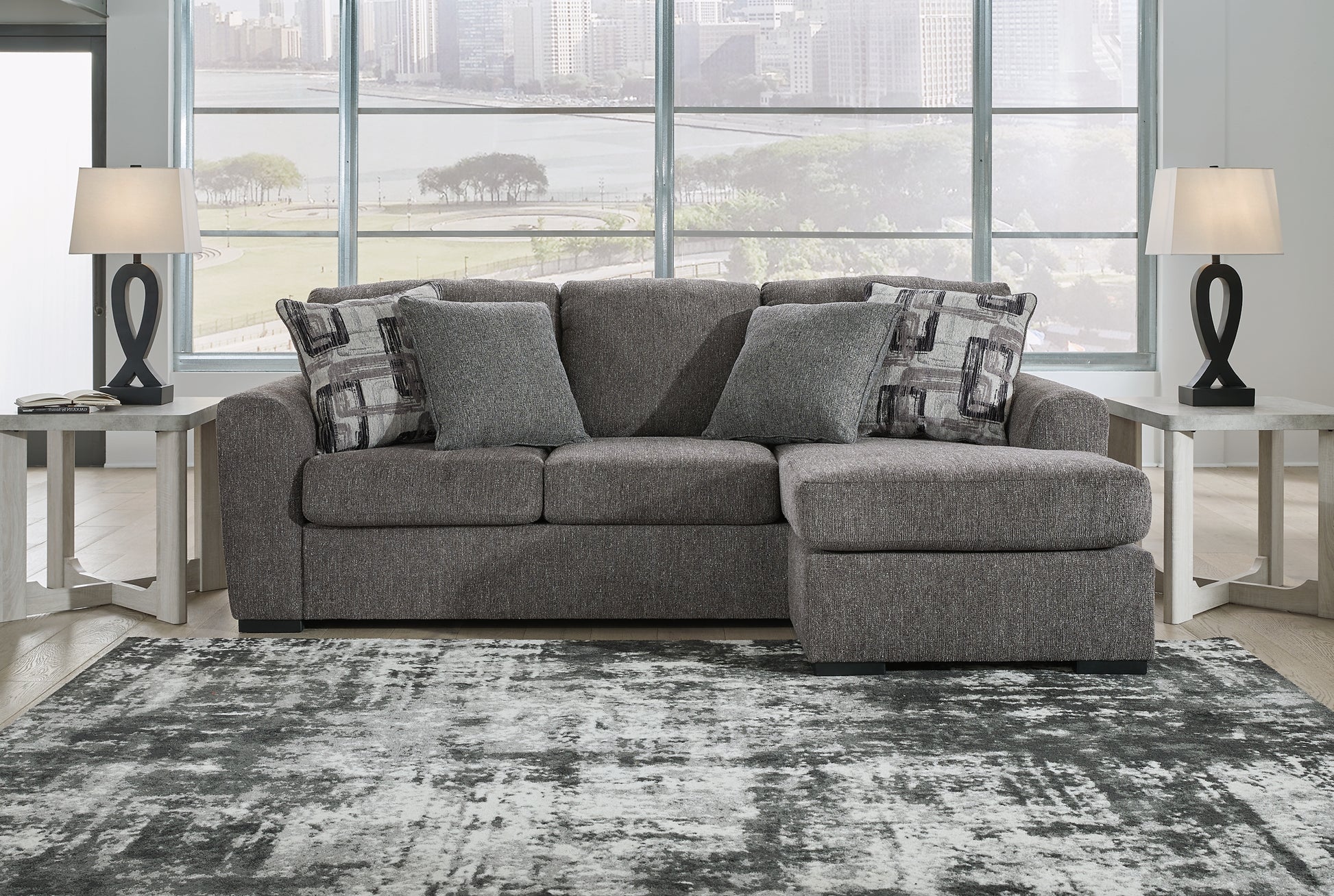 | Details | Corner-blocked frame, Attached back and reversible seat cushions, Chaise can be positioned on either side (thanks to reversible seat cushion and movable ottoman), High-quality foam cushions wrapped in poly fiber, Accent pillows included, Pillows with soft polyfill, Polyester upholstery, Exposed feet with faux wood finish, Platform foundation system resists sagging 3x better than spring system after 20,000 testing cycles by providing more even support, Smooth platform foundation maintains tight, wrinkle-free look without dips or sags that can occur over time with sinuous spring foundations | |
